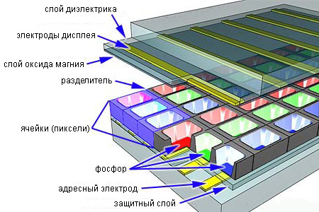 Плазменная панель представляет собой матрицу газонаполненных ячеек, заключенных между двумя параллельными стеклянными пластинами, внутри которых расположены прозрачные электроды, образующие шины сканирования, подсветки и адресации.